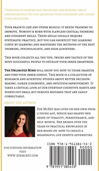 Terrified of making bad decisions and missing great opportunities? Do you question your judgment and doubt your intuition? Your brain is like any other muscle: it needs training to improve. Nobody is born with flawless critical thinking and judgment skills. These skills usually require systematic practice, but you can shortcut the learning curve by learning and mastering the methods of the best thinkers, psychologists, and high achievers. This book collects all the tips, tricks and tactics of the most successful people to develop your inner smartness. The Unlimited Mind will show you how to think smarter and find your inner genius. This book is a collection of research and scientific studies about better decision-making, fairer judgments, and intuition improvement. It takes a critical look at our everyday cognitive habits and points out small but serious mistakes that are easily correctable. Discover and utilize the uncharted parts of your brain. Zoe McKey has studied human cognition for over a decade. To her, it was essential to know how others think to secure her own survival. This book collects her personal experiences and some of the most famous studies in cognitive improvement and social psychology to show you the way to better critical thinking, decision-making, and judgment. Leave analysis paralysis for yesterday. Learn: •How to overcome your mental blocks and improve your life •How to discover your "personal excellence" •The advantages of thinking like a professional and not an amateur •How to bring out your best creative thinking •Improve your intuition skills quickly and permanently Don't get stuck on decisions ever again. •Learn to use the 6 Hats Method(TM) to make the best multilateral decisions •Master your time management with Philip Zimbardo's time paradox theory •Learn to set goals like a champion with Arnold Schwarzenegger If you commit to practicing the techniques in this book you'll learn to gather and assess relevant information instead of an unfocused mass of data. You'll have a self-directed, self-monitored, self-disciplined, and self-corrective way of thinking. You'll know how to analyze situations from different angles so you won't jump to hasty, premature conclusions but well-founded, objective ones. You will make better predictions, reduce regrets that follow a bad decision and become more aware of your life in general.