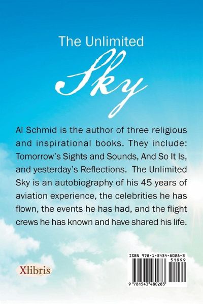 The Unlimited Sky is a book, written by Albert Schmid that answers the question, Why did you ever get into aviation? It tells the story of the authors lifelong career in aviation from the time he took his very first flight, to his experiences as Naval Aviator, followed by flying as a corporate pilot. It describes his career change when he moved to the marketing and demonstrating of new airplanes for manufactures. He tells of his challenges in developing a charter business with small jets and turbo-props. Through his flying experiences he has been blessed to have met and flown a number of famous celebrities including the Dahlia Lama. Each flight was a new adventure and another story. His career encompasses 54 years, accruing over 27,500 hours. Someone once said, Aviation is the hardest business to get in and the toughest to leave. After retirement Schmid chose to become a Baptist minister and has written several inspired and devotional books.