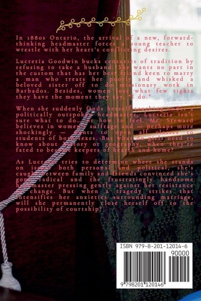 In 1880s Ontario, the arrival of a new, forward-thinking headmaster forces a young teacher to wrestle with her heart's conflicting desires. Lucretia Goodwin bucks centuries of tradition by refusing to take a husband. She wants no part in the custom that has her best friend keen to marry a man who treats her poorly and whisked a beloved sister off to do missionary work in Barbados. Besides, women lose what few rights they have the moment they say, "I do." When she suddenly finds herself teaching under a politically outspoken headmaster, Lucretia isn't sure what to do... or how to feel. Mr. Steward believes in women's suffrage and - perhaps more shockingly - wants to open all classes to students of both sexes. But what do girls need to know about history or geography, when they're fated to become keepers of hearth and home? As Lucretia tries to determine where she stands on issues both personal and political, she's caught between family and friends convinced she's gone radical and the frustratingly handsome headmaster pressing gently against her resistance to change. But when a tragedy strikes that intensifies her anxieties surrounding marriage, will she permanently close herself off to the possibility of courtship?