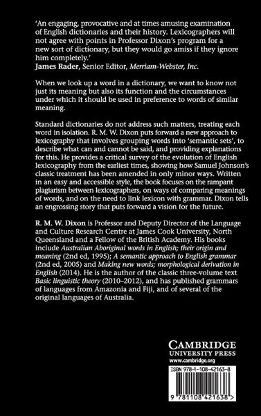 When we look up a word in a dictionary, we want to know not just its meaning but also its function and the circumstances under which it should be used in preference to words of similar meaning. Standard dictionaries do not address such matters, treating each word in isolation. R. M. W. Dixon puts forward a new approach to lexicography that involves grouping words into 'semantic sets', to describe what can and cannot be said, and providing explanations for this. He provides a critical survey of the evolution of English lexicography from the earliest times, showing how Samuel Johnson's classic treatment has been amended in only minor ways. Written in an easy and accessible style, the book focuses on the rampant plagiarism between lexicographers, on ways of comparing meanings of words, and on the need to link lexicon with grammar. Dixon tells an engrossing story that puts forward a vision for the future.