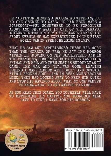 BOOK THREE He was Peter Birger, a decorated veteran, but no one seemed to care. He had been made a scapegoat—put somewhere to be forgotten about and shut away in one of the darkest asylums in the history of England. Kept quiet about events he had experienced in the First World War in Ypres, Belgium in 1917. What he saw and experienced there was more than the horror of war; he saw the horror within it...moving on the battlefield and in the trenches, consuming both friend and foe, animal and man. And then just as suddenly as it came, the war and ‘it’…was gone. Leaving behind a man, ridden with guilt and outcast with a broken soul—and an even more broken mind. They had locked away to keep him quiet and stop his ravings about what no one wanted to know…what no one wanted to name. As you read this diary, you yourself will have to determine his sanity…You yourself will have to find a name for his horror.