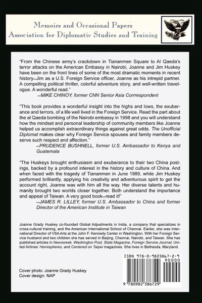 The book describes the author's experiences in China during the 1989 "Beijing Spring." It moves to India, and then Kenya at the time of the American Embassy bombing in Nairobi. "From the Chinese army's crackdown in Tiananmen Square to Al Qaeda's terror attacks on the American Embassy in Nairobi, Joanne and Jim Huskey have been on the front lines of some of the most dramatic moments in recent history¿Jim as a U.S. Foreign Service officer, Joanne as his intrepid partner. A compelling political thriller, colorful adventure story, and well-written travel-ogue, The Unofficial Diplomat provides a revealing behind-the-scenes glimpse of what life is really like for our diplomats and their families as they face the challenges of representing the United States while seeking to carve out a semblance of normal existence in a tumultuous world. A wonderful read." ¿MIKE CHINOY, former CNN Senior Asia Corrrespondent "This book provides a wonderful insight into the highs and lows, the exuberance and terrors, of a life well lived in the Foreign Service. Read the part about the al Qaeda bombing of the Nairobi embassy in 1998 and you will understand how the mindset and personal leadership of community members like Joanne helped us accomplish extraordinary things against great odds. The Unofficial Diplomat makes clear why Foreign Service spouses and family members deserve such respect and affection." ¿PRUDENCE BUSHNELL, former U.S. Ambassador to Kenya and Guatemala "The Huskeys brought enthusiasm and exuberance to their two China postings, backed by a profound interest in the history and culture of China. And when faced with the tragedy of Tiananmen in June 1989, while Jim Huskey performed brilliantly, applying his creativity and adventurous spirit to get the account right, Joanne was with him all the way. Her diverse talents and humanity brought two worlds closer together. Both understand the importance and appeal of Taiwan and yet clearly know the power of China in our future. A very good book¿read it!" ¿JAMES R. LILLEY, former U.S. Ambassador to China and former Director of the American Institute in Taiwan