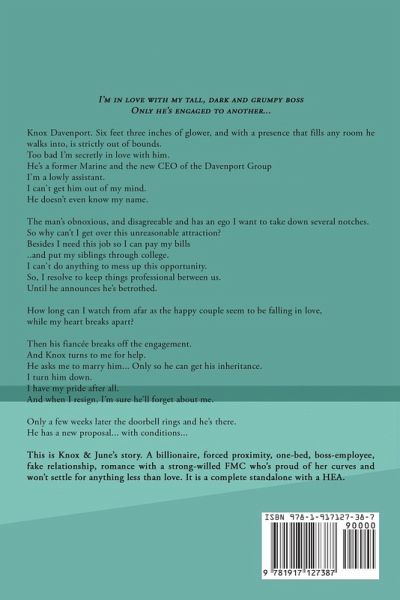 I'm in love with my tall, dark and grumpy boss Only he's engaged to another... Knox Davenport. Six feet three inches of glower, ... and with a presence that fills any room he walks into, is strictly out of bounds. Too bad I'm secretly in love with him. He's a former Marine and the new CEO of the Davenport Group I'm his assistant. He doesn't even know my name. I can't stop thinking of him. I need this job so I can pay my bills ..and putting my siblings through college. Besides where's my self-respect? The man's obnoxious, and disagreeable and has an ego, I want to take down several notches. So why can't I get over this unreasonable attraction? I resolve to keep things professional between us. Until he announces he's betrothed. How long can I watch from afar while my heart breaks apart? I leave the job, sure he'll forget about me. Only a few weeks later the doorbell rings and he's there. He has a new proposal... with conditions... This is Knox & June's story. A billionaire, forced proximity, one-bed, boss-employee, fake relationship, romance with a strong-willed FMC who's proud of her curves and won't settle for anything less than love. It is a complete standalone with a HEA.