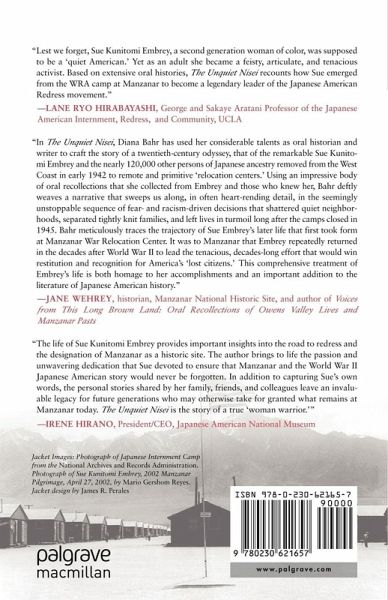 "Lest we forget, Sue Kunitomi Embrey, a second generation woman of color, was supposed to be a 'quiet American.' Yet as an adult she became a feisty, articulate, and tenacious activist. Based on extensive oral histories, The Unquiet Nisei recounts how Sue emerged from the WRA camp at Manzanar to become a legendary leader of the Japanese American Redress movement." - Lane Ryo Hirabayashi, George and Sakaye Aratani Professor of the Japanese American Internment, Redress,and Community, UCLA"In The Unquiet Nisei, Diana Bahr has used her considerable talents as oral historian and writer to craft the story of a twentieth-century odyssey, that of the remarkable Sue Kunitomi Embrey and the nearly 120,000 other persons of Japanese ancestry removed from the West Coast in early 1942 to remote and primitive 'relocation centers.' Using an impressive body of oral recollections that she collected from Embrey and those who knew her, Bahr deftly weaves a narrative that sweeps us along, in often heart-rending detail, in the seemingly unstoppable sequence of fear- and racism-driven decisions that shattered quiet neighborhoods, separated tightly knit families, and left lives in turmoil long after the camps closed in 1945. Bahr meticulously traces the trajectory of Sue Embrey's later life that first took form at Manzanar War Relocation Center. It was to Manzanar that Embrey repeatedly returned in the decades after World War II to lead the tenacious, decades-long effort that would win restitution and recognition for America's 'lost citizens.' This comprehensive treatment of Embrey's life is both homage to her accomplishments and an important addition to the literature of Japanese American history." - Jane Wehrey, historian, Manzanar National Historic Site, and author of Voices from This Long Brown Land: Oral Recollections of Owens Valley Lives and Manzanar Pasts"The life of Sue Kunitomi Embrey provides important insights into the road to redress and the designation of Manzanar as a historic site. The author brings to life the passion and unwavering dedication that Sue devoted to ensure that Manzanar and the World War II Japanese American story would never be forgotten. In addition to capturing Sue s own words, the personal stories shared by her family, friends, and colleagues leave an invaluable legacy for future generations who may otherwise take for granted what remains at Manzanar today. The Unquiet Nisei is the story of a true 'woman warrior.'" - Irene Hirano, President/CEO, Japanese American National Museum