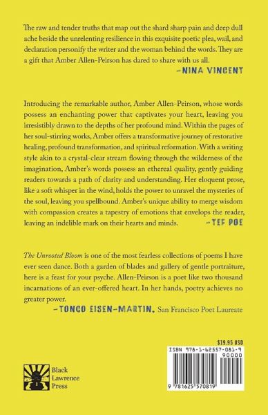 The raw and tender truths that map out the shard sharp pain and deep dull ache beside the unrelenting resilience in this exquisite poetic plea, wail, and declaration personify the writer and the woman behind the words. They are a gift that Amber Allen-Peirson has dared to share with us all.-Nina Vincent