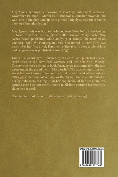 The Unseen Bridegroom is a gothic novel by May Agnes Fleming. May Agnes Fleming(pseudonyms, Cousin May Carleton, M. A. Earlie; November 15, 1840 - March 24, 1880) was a Canadian novelist. She was "one of the first Canadians to pursue a highly successful career as a writer of popular fiction." May Agnes Early was born in Carleton, West Saint John, in the Colony of New Brunswick, the daughter of Bernard and Mary Early. May Agnes began publishing while studying at school. She married an engineer, John W. Fleming, in 1865. She moved to New York two years after her first novel, Erminie; or The gypsy's vow: a tale of love and vengeance was published there (1863). Under the pseudonym "Cousin May Carleton", she published several serial tales in the New York Mercury and the New York Weekly. Twenty-one were printed in book form, seven posthumously. She also wrote under the pseudonym, "M.A. Earlie". The exact count is unclear, since her works were often retitled, but is estimated at around 40, although some were not actually written by her, but were attributed to her by publishers cashing in on her popularity. At her peak, she was earning over $10,000 yearly, due to publishers granting her exclusive rights to her work. She died in Brooklyn, of Bright's disease. (wikipedia.org)