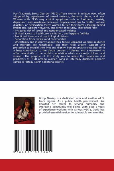 Post-Traumatic Stress Disorder (PTSD) affects women in unique ways, often triggered by experiences of sexual violence, domestic abuse, and war. Women with PTSD may exhibit symptoms such as flashbacks, anxiety, depression, and avoidance behaviors. Displacement due to conflict, natural disasters, or persecution forces women to flee their homes, leaving behind livelihoods, support networks, and sense of security. They often face:- Increased risk of sexual and gender-based violence- Limited access to healthcare, sanitation, and hygiene facilities- Emotional trauma and psychological distress- Separation from families and communities- Uncertainty and insecurity about their future Displaced women's resilience and strength are remarkable, but they need urgent support and protection to rebuild their lives and dignity. Post-traumatic stress disorder is a large contributor to the global burden of disease and is estimated to affect almost 4% of the world's population which are mostly children and women. The purpose of this study was to assess the prevalence and predictors of PTSD among women living in internally displaced persons' camps in Plateau North Senatorial District.