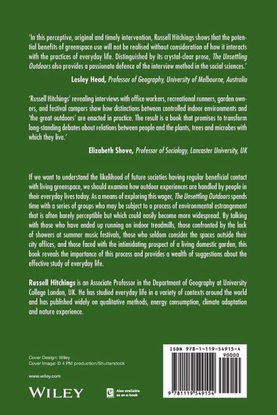 'In this perceptive, original and timely intervention, Russell Hitchings shows that the potential benefits of greenspace use will not be realised without consideration of how it interacts with the practices of everyday life. Distinguished by its crystal-clear prose, The Unsettling Outdoors also provides a passionate defence of the interview method in the social sciences.'