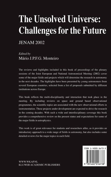 The Joint European and National Astronomical Meeting (JENAM) of 2002, was held in Porto - Portugal (2-7 September 2002), corresponding to the I ph Meeting of the European Astronomical Society (EAS) and the IJ! En contra Nacional de Astronomia e Astroftsica (12ENAA) of the Sociedade Portuguesa de Astronomia (SPA). Portugal has a small and young community of researchers in Astronomy. This meeting have had an important role in marking the beginning of what we expect to be a new phase for Astronomy in Portugal. The fact that we have chosen to address '"the future" reflects this will of the Portuguese com munity to share and discuss our commitment for the next decades with our colleagues. The meeting, titled "The Unsolved Universe: Challenges for the Fu ture", aimed at discussing some of the major research programmes and objec tives for the next decades. The scientific programme included the plenary ses sions (invited reviews and highlight talks), whose contributions are published in this book, and several workshops on more specific topics.