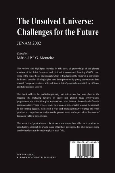 The Joint European and National Astronomical Meeting (JENAM) of 2002, was held in Porto - Portugal (2-7 September 2002), corresponding to the I ph Meeting of the European Astronomical Society (EAS) and the IJ! En contra Nacional de Astronomia e Astroftsica (12ENAA) of the Sociedade Portuguesa de Astronomia (SPA). Portugal has a small and young community of researchers in Astronomy. This meeting have had an important role in marking the beginning of what we expect to be a new phase for Astronomy in Portugal. The fact that we have chosen to address '"the future" reflects this will of the Portuguese com munity to share and discuss our commitment for the next decades with our colleagues. The meeting, titled "The Unsolved Universe: Challenges for the Fu ture", aimed at discussing some of the major research programmes and objec tives for the next decades. The scientific programme included the plenary ses sions (invited reviews and highlight talks), whose contributions are published in this book, and several workshops on more specific topics.