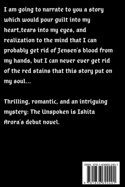 The Unspoken is tragic romance novel which presents forth a perfect combination of romance, mystery, tragedy, thriller,and crime. The story is based on the love saga of Grace and Jensen: lovers who were not supposed to fall in love. Every chapter will unravel another from their past which will be followed with sharp twists and turns in their tragic love story. What is it that still remains unspoken between the two of them? Who is it now that is going to turn their life upside down? What end will these lovers get-a successful marriage or a story of inconclusive love? What is that one secret that still remains unspoken between them.Well,you will soon know answers to all these questions as you journey through their love story full of mysteries, lies, and thrill.