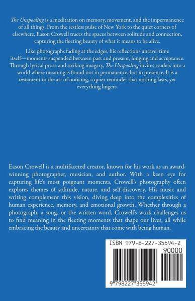 The Unspooling is a meditation on memory, movement, and the impermanence of all things. From the restless pulse of New York to the quiet corners of elsewhere, Eason Crowell traces the spaces between solitude and connection, capturing the fleeting beauty of what it means to be alive. Like photographs fading at the edges, his reflections unravel time itself-moments suspended between past and present, longing and acceptance. Through lyrical prose and striking imagery, The Unspooling invites readers into a world where meaning is found not in permanence, but in presence. It is a testament to the art of noticing, a quiet reminder that nothing lasts, yet everything lingers.