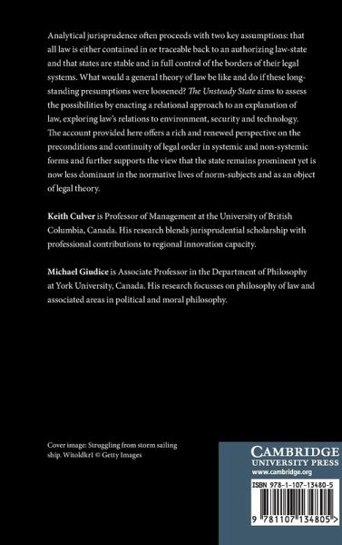 Analytical jurisprudence often proceeds with two key assumptions: that all law is either contained in or traceable back to an authorizing law-state, and that states are stable and in full control of the borders of their legal systems. What would a general theory of law be like and do if these long-standing presumptions were loosened? The Unsteady State aims to assess the possibilities by enacting a relational approach to explanation of law, exploring law's relations to the environment, security, and technology. The account provided here offers a rich and renewed perspective on the preconditions and continuity of legal order in systemic and non-systemic forms, and further supports the view that the state remains prominent yet is now less dominant in the normative lives of norm-subjects and as an object of legal theory.