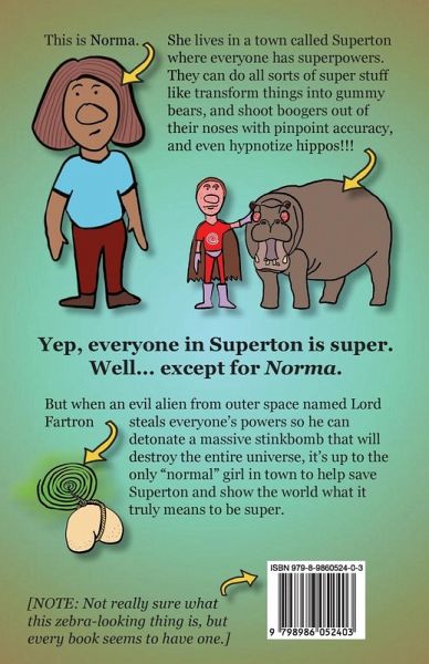 This is the story of a 10-year-old girl named Norma who lives in a town called Superton where everyone has superpowers. They can do all sorts of super stuff like transform things into gummy bears, and shoot boogers out of their noses with pinpoint accuracy, and even hypnotize hippos!!! Yep, everyone in Superton is super. Well... except for Norma. ¿But when an evil alien from outer space named Lord Fartron uses an intergalactic whirlpool to steal everyone's powers so he can detonate a massive stinkbomb that will destroy the entire universe, it's up to the only "normal" girl in town to help save Superton and show the world what it truly means to be super.
