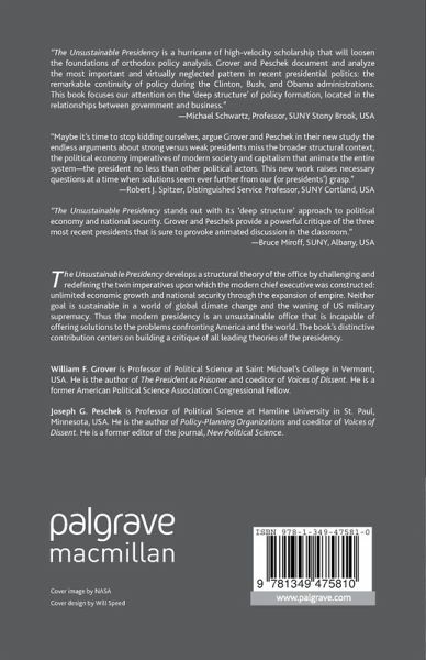 "The Unsustainable Presidency is more than a breath of fresh air, it is hurricane of high velocity scholarship that will loosen the foundations of orthodox policy analysis. Grover and Peschek document and analyze the most important and virtually neglected pattern in recent presidential politics: the remarkable continuity of policy during the Clinton, Bush, and Obama administrations. In doing so they focus our attention on the 'deep structure' of policy formation, located in the relationships between government and business. The vivid portrait that emerges clarifies the structural constraints that assure that, if normal politics prevail, the application of presidential power will relentlessly conform to the interests and demands of the corporate class." - Michael Schwartz, Professor, SUNY Stony Brook, USA