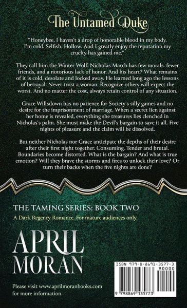 They call him the Winter Wolf. Nicholas March, the Duke of Richeforte, has few morals, fewer friends, and a notorious lack of honor. And his heart? What remains of it is cold, desolate and locked away. He learned long ago the lessons of betrayal. Never trust a woman. Recognize that others, even friends, will expect the worst of him. And no matter the cost, always retain control of any situation. It is infuriating when a slip of a girl cracks his icy façade. Irrepressible Grace Willsdown is neither daunted nor impressed by the rigid duke. She has no patience for the silly games of London's society and no desire for the imprisonment of marriage. When a secret encumbrance against her home is revealed, everything she treasures is cradled in Nicholas March's palm. She makes a Devil's bargain to save it all. Five nights of secret pleasure with the duke and all claims will be dissolved. But neither Grace nor Nicholas anticipate the depths of their craving following that first night. It is a desire that won't be denied. Consuming. Blistering. Tender and brutally passionate. The boundaries become distorted. What is the part of the bargain? And what is true emotion? The key to unlock their love is within their grasp. Will they brave the storms and fires? Or turn their backs when their five nights are done?