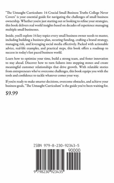 "The Untaught Curriculum" reveals the 14 essential lessons every small business owner needs to succeed, truths no classroom ever covered. From building a business plan and securing funding to managing risks and mastering social media, this guide delivers actionable advice and real world strategies. Packed with relatable stories and practical steps, this book will help you:Optimize your time and resources. Build a strong, innovative team. Turn failures into opportunities. Create lasting customer relationships. Whether you're starting out or leveling up, "The Untaught Curriculum" gives you the tools and confidence to overcome challenges and achieve your business goals.