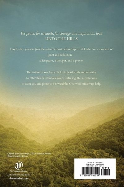 No matter your place in life, this inspiring collection of 365 devotional readings is designed to bring you daily to a special place of renewal-- to help you pause and gaze "unto the hills" for help and inspiration. Each of the 365 daily readings in this inspiring collection was distilled from a lifetime of study and ministry. This devotional supplies daily food for thought about living fruitfully and joyfully in an often-fretful world. Every day of the year, you can join our nation's most beloved spiritual leader for a moment of quiet and reflection through: A carefully chosen passage of scripture A brief, thoughtful message from Billy Graham A heartfelt prayer composed especially for this devotional Simple, direct, encouraging yet challenging, this book will be a heartening companion for your daily walk in the valley. This collection is a gentle but constant reminder that we can find help for all our needs as long as we remember to look up . . . unto the hills, but especially unto the Lord, the One who can always help.