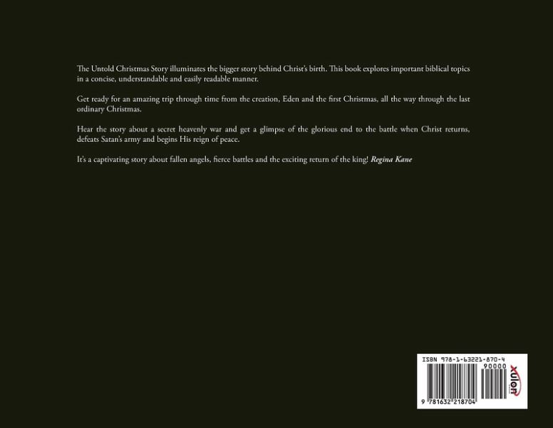 The Untold Christmas Story illuminates the bigger story behind Christ's birth. This book explores important biblical topics in a concise, understandable and easily readable manner. Get ready for an amazing trip through time from the creation, Eden and the first Christmas, all the way through the last ordinary Christmas. Hear the story about a secret heavenly war and get a glimpse of the glorious end to the battle when Christ returns,defeats Satan's army and begins His reign of peace. It's a captivating story about fallen angels, fierce battles and the exciting return of the king!
