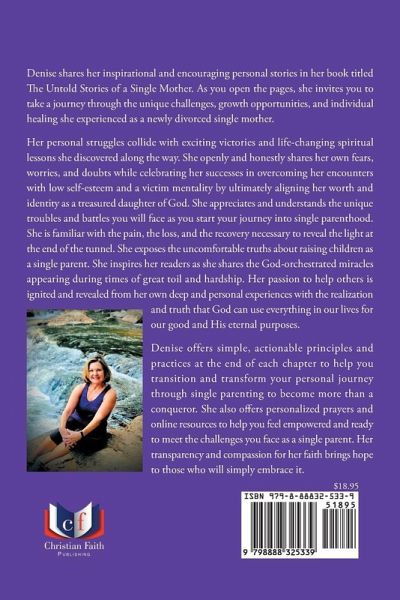 Denise shares her inspirational and encouraging personal stories in her book titled The Untold Stories of a Single Mother. As you open the pages, she invites you to take a journey through the unique challenges, growth opportunities, and individual healing she experienced as a newly divorced single mother. Her personal struggles collide with exciting victories and life-changing spiritual lessons she discovered along the way. She openly and honestly shares her own fears, worries, and doubts while celebrating her successes in overcoming her encounters with low self-esteem and a victim mentality by ultimately aligning her worth and identity as a treasured daughter of God. She appreciates and understands the unique troubles and battles you will face as you start your journey into single parenthood. She is familiar with the pain, the loss, and the recovery necessary to reveal the light at the end of the tunnel. She exposes the uncomfortable truths about raising children as a single parent. She inspires her readers as she shares the God-orchestrated miracles appearing during times of great toil and hardship. Her passion to help others is ignited and revealed from her own deep and personal experiences with the realization and truth that God can use everything in our lives for our good and His eternal purposes. Denise offers simple, actionable principles and practices at the end of each chapter to help you transition and transform your personal journey through single parenting to become more than a conqueror. She also offers personalized prayers and online resources to help you feel empowered and ready to meet the challenges you face as a single parent. Her transparency and compassion for her faith brings hope to those who will simply embrace it.