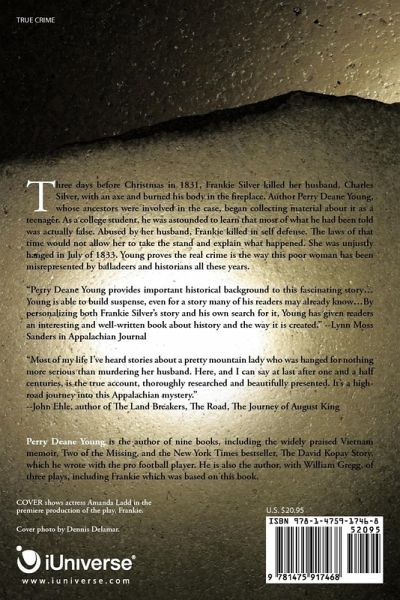 Three days before Christmas in 1831, Frankie Silver killed her husband, Charles Silver, with an axe and burned his body in the fireplace. Author Perry Deane Young, whose ancestors were involved in the case, began collecting material about it as a teenager. As a college student, he was astounded to learn that most of what he had been told was actually false. Abused by her husband, Frankie killed in self defense. The laws of that time would not allow her to take the stand and explain what happened. She was unjustly hanged in July of 1833. Young proves the real crime is the way this poor woman has been misrepresented by balladeers and historians all these years. "Perry Deane Young provides important historical background to this fascinating story... Young is able to build suspense, even for a story many of his readers may already know...By personalizing both Frankie Silver's story and his own search for it, Young has given readers an interesting and well-written book about history and the way it is created." --Lynn Moss Sanders in Appalachian Journal "Most of my life I've heard stories about a pretty mountain lady who was hanged for nothing more serious than murdering her husband. Here, and I can say at last after one and a half centuries, is the true account, thoroughly researched and beautifully presented. It's a highroad journey into this Appalachian mystery." --John Ehle, author of The Land Breakers, The Road, The Journey of August King