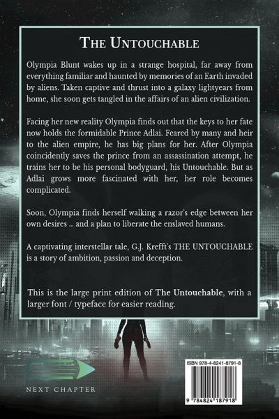 Olympia Blunt wakes up in a strange hospital, far away from everything familiar and haunted by memories of an Earth invaded by aliens. Taken captive and thrust into a galaxy lightyears from home, she soon gets tangled in the affairs of an alien civilization. Facing her new reality Olympia finds out that the keys to her fate now holds the formidable Prince Adlai. Feared by many and heir to the alien empire, he has big plans for her. After Olympia coincidently saves the prince from an assassination attempt, he trains her to be his personal bodyguard, his Untouchable. But as Adlai grows more fascinated with her, her role becomes complicated. Soon, Olympia finds herself walking a razor's edge between her own desires ... and a plan to liberate the enslaved humans. A captivating interstellar tale, G.J. Krefft's THE UNTOUCHABLE is a story of ambition, passion and deception. This is the large print edition of The Untouchable, with a larger font / typeface for easier reading.