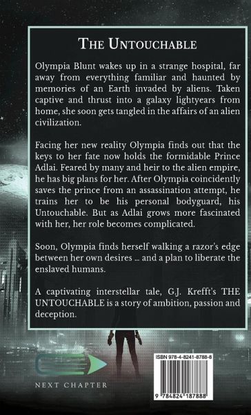 Olympia Blunt wakes up in a strange hospital, far away from everything familiar and haunted by memories of an Earth invaded by aliens. Taken captive and thrust into a galaxy lightyears from home, she soon gets tangled in the affairs of an alien civilization. Facing her new reality Olympia finds out that the keys to her fate now holds the formidable Prince Adlai. Feared by many and heir to the alien empire, he has big plans for her. After Olympia coincidently saves the prince from an assassination attempt, he trains her to be his personal bodyguard, his Untouchable. But as Adlai grows more fascinated with her, her role becomes complicated. Soon, Olympia finds herself walking a razor's edge between her own desires ... and a plan to liberate the enslaved humans. A captivating interstellar tale, G.J. Krefft's THE UNTOUCHABLE is a story of ambition, passion and deception.