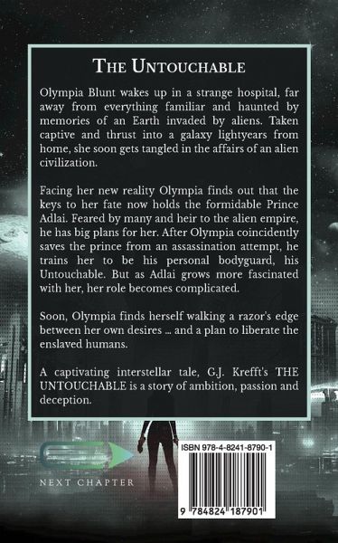 Olympia Blunt wakes up in a strange hospital, far away from everything familiar and haunted by memories of an Earth invaded by aliens. Taken captive and thrust into a galaxy lightyears from home, she soon gets tangled in the affairs of an alien civilization. Facing her new reality Olympia finds out that the keys to her fate now holds the formidable Prince Adlai. Feared by many and heir to the alien empire, he has big plans for her. After Olympia coincidently saves the prince from an assassination attempt, he trains her to be his personal bodyguard, his Untouchable. But as Adlai grows more fascinated with her, her role becomes complicated. Soon, Olympia finds herself walking a razor's edge between her own desires ... and a plan to liberate the enslaved humans. A captivating interstellar tale, G.J. Krefft's THE UNTOUCHABLE is a story of ambition, passion and deception.