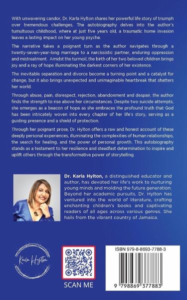 The award winning autobiography explores the author's powerful life story of triumph over tremendous challenges. The autobiography delves into the author's tumultuous childhood, where at just five years old, a traumatic home invasion leaves a lasting impact on her young psyche. The narrative takes a poignant turn as the author navigates through a twenty-seven-year-long marriage to a narcissistic partner, enduring oppression and mistreatment. Amidst the turmoil, the birth of her two beloved children brings joy and a ray of hope illuminating the darkest corners of her existence. The inevitable separation and divorce become a turning point and a catalyst for change, but it also brings unexpected and unimaginable heartbreak that shatters her world. Through abuse, pain, disrespect, rejection, abandonment and despair, the author finds the strength to rise above her circumstances. Despite two suicide attempts, she emerges as a beacon of hope as she embraces the profound truth that God has been intricately woven into every chapter of her life's story, serving as a guiding presence and a shield of protection. Through her poignant prose, the author offers a raw and honest account of these deeply personal experiences, illuminating the complexities of human relationships, the search for healing, and the power of personal growth. This autobiography stands as a testament to her resilience and steadfast determination to inspire and uplift others through the transformative power of storytelling.