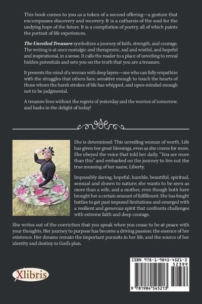 This book comes to you as a token of a second offeringa gesture that encompasses discovery and recovery. It is a catharsis of the soul for the undying hope of the future. It is a compilation of poetry, all of which paints the portrait of life experiences. The Unveiled Treasure symbolizes a journey of faith, strength, and courage. The writing is at once nostalgic and therapeutic, sad and wistful, and hopeful and inspirational, in a sense. It calls the reader to a place of unveiling to reveal hidden potentials and sets you on the truth that you are a treasure. It presents the mind of a woman with deep layersone who can fully empathize with the struggles that others face, sensitive enough to touch the hearts of those whom the harsh strokes of life have whipped, and open-minded enough not to be judgmental. A treasure lives without the regrets of yesterday and the worries of tomorrow, and basks in the delight of today!