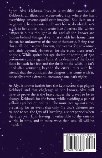 Sprite Alya Lightstar lives in a wealthy sanction of Keldrock, an illustrious elven-ruled city where she has everything anyone could ever imagine. She lives on a large estate, has servants, and hasn’t had to do a hard day’s work in her entire life. It seems like a perfect life, where danger is but a thought as she and all she knows are hidden behind a magical veil that shields her home from the far, far unknowns of the rest of the world. Being that this is all she has ever known, she yearns for adventure and lands beyond. However, for she-elves, these aren’t options. While sprites her age dream of coming-of-age ceremonies and elegant balls, Alya dreams of the forest floor beneath her feet and the thrills of the wilds. It isn’t until after venturing beyond the city's limits with her friends that she considers the dangers that come with it, especially after a dreadful encounter one dark night. As Alya is drawn farther into the kept secrets that plague Keldrock and that challenge all she knows, Alya will have to prove she is the brave leader she craves to be to change Keldrock for the better while avoiding a pair of yellow eyes hot on her trail. She must race against time, preparing for an event that only the city’s defenses are trained to see, the Day of Unveiling, a short period when the city’s veil falls, leaving it vulnerable to the outside world. In time, and in more ways than one, all will be unveiled.