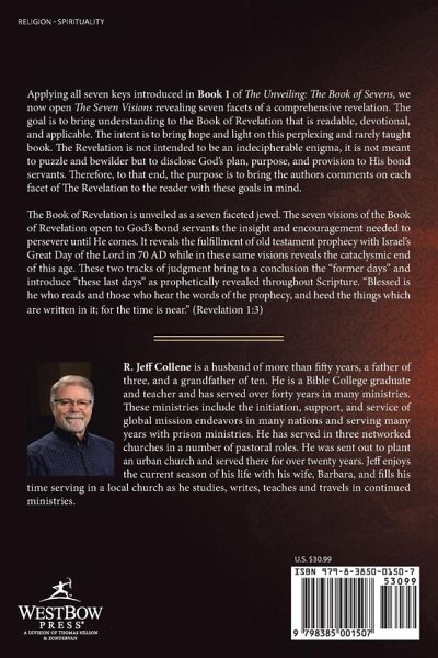 Applying all seven keys introduced in Book 1 of The Unveiling: The Book of Sevens, we now open The Seven Visions revealing seven facets of a comprehensive revelation. The goal is to bring understanding to the Book of Revelation that is readable, devotional, and applicable. The intent is to bring hope and light on this perplexing and rarely taught book. The Revelation is not intended to be an indecipherable enigma, it is not meant to puzzle and bewilder but to disclose God's plan, purpose, and provision to His bond servants. Therefore, to that end, the purpose is to bring the authors comments on each facet of The Revelation to the reader with these goals in mind. The Book of Revelation is unveiled as a seven faceted jewel. The seven visions of the Book of Revelation open to God's bond servants the insight and encouragement needed to persevere until He comes. It reveals the fulfillment of old testament prophecy with Israel's Great Day of the Lord in 70 AD while in these same visions reveals the cataclysmic end of this age. These two tracks of judgment bring to a conclusion the "former days" and introduce "these last days" as prophetically revealed throughout Scripture. "Blessed is he who reads and those who hear the words of the prophecy, and heed the things which are written in it; for the time is near." (Revelation 1:3)