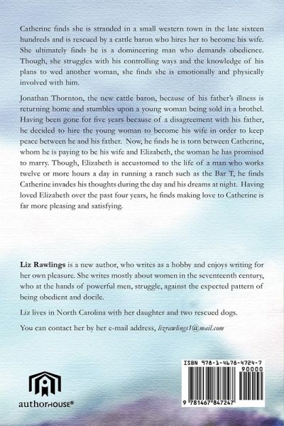 Catherine finds herself stranded in a small western town in the late sixteen hundreds and is rescued by a cattle baron, who hires her to become his wife, for, how ever long he needs her. She ultimately finds that he is a domineering man, who demands obedience and during her struggle with his controlling ways she falls in love with him and finds herself emotionally and physically involved with him even though he prepares to marry another woman. Jonathan Thornton, the new cattle baron, because, of his father's illness is returning home and stumbles upon a young woman being sold to a brothel and he rescues her and ultimately hires her to marry him in order to keep peace, between he and his father for the two men had a disagreement causing Johnny to leave home five years ago. Now, he finds himself torn, between Catherine the woman he hired to act as his wife, who invades this thoughts during the day and his dreams at night and gives him peace and contentment when he makes love to her and Elizabeth, the woman with whom he is engaged to be married as they have been meeting and writing secretly over the past five years and is use to the life of a man who works twelve or more hours a day in running a ranch as the Bar T.