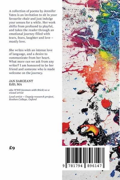 "A collection of poems by Jennifer Yates is an invitation to sit in your favourite chair and just indulge your senses for a while. Her work shifts from profound to playful, and takes the reader through an emotional journey filled with tears, fears, laughter and love - mostly love. She writes with an intense love of language, and a desire to communicate from her heart. What more can we ask from any writer? I am honoured to be her friend and someone who is made welcome on the journey." JAN SARGEANT, EdD, MA
