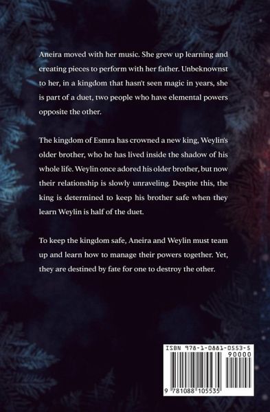 Aneira moved with her music. She grew up learning and creating pieces to perform with her father. Unbeknownst to her, in a kingdom that hasn't seen magic in years, she is part of a duet, two people who have elemental powers opposite each other. The kingdom of Esmra has crowned a new king, Weylin's older brother, who he has lived inside the shadow of his whole life. Weylin once adored his older brother, but now their relationship is slowly unreveling. Despite this, the king is determined to keep his brother safe when they learn Weylin is half of the duet. To keep the kingdom safe, Aneira and Weylin must team up and learn how to manage their powers together. Yet, they are destined by fate for one to destory the other.
