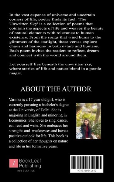 This is author's debut book. As the name of the book 'The Unwritten Sky' suggests, future is unpredictable and we have the authority to write our own skies. While learning from various natural elements around us, we can easily improve and write the best version of ourselves. This book resonates with the idea of complimenting nature and a scope of learning which can be a source of inspiration for humanity.