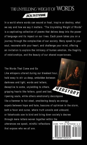 In a world where words can wound or heal, inspire or destroy, what we say and how we say it matters. "The Unyielding Weight of Words" is a captivating collection of poems that delves deep into the power of language and its impact on our lives. Each poem takes you on a journey through the complexities of our society. Many speak to your soul, resonate with your heart, and challenge your mind, offering an invitation to explore the intricacy of human emotion, the fragility of relationships, and the beauty of our shared experiences.