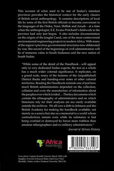 It also includes documentation on the origins of the Jonglei Canal, one of the most controversial environmental engineering projects in modern Africa. With many of the region’s previous governmental structures now obliterated by war, this record of the beginnings of civil administration will be of immense value to South Sudanese and the new nation of South Sudan. Editorial Reviews Review `fascinating book ... admirably researched' Philip Lyon Roussel, African Affairs, July 1997 `Willis's Handbook is ... more than most, both a political and a personal document, a swan-song to defend his policies as much as an objective description of his province ... a welcome addition to the historical record of the Condominium. Half a century late, as the editor notes, it provides striking commentary on events in a region even now in the throes of civil war.' M.W. Daly, Bulletin of the School of Oriental and African Studies Vol. 60, No. 2 '97 `It replicates, on a grand scale, many of the features of the (unpublished) District Books and handing-over notes of other colonial territories. We all owe a debt to Johnson and the British Academy for making the handbook available, not merely as a source but also as a memorial to a world whose contradictions remain even while its substance is fast being overlaid or destroyed by forces more ruthless than amateur ethnographers and ex-military administrators.' Richard Waller, Bucknell University, Lewisburg PA, Journal of African History, Vol. 38 - 1997 About the Author Douglas H. Johnson, Research Fellow, St Anthony's College, Oxford.