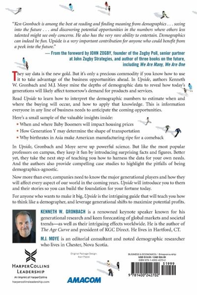 Demographics not only define who we are, where we live, and how our numbers change, but they open up hidden business opportunities that lie ahead. What will happen when retiring Boomers free up jobs? How will Generation Y alter housing and transportation? Which states will have the most dynamic workforces when the Millennials settle into their careers? The next generational wave is shaking up the rank and file. How will it all affect you? Demographer Kenneth Gronbach has put this powerful yet little-understood science to work finding the answers to all these questions and more. After synthesizing data to show how the different generations have impacted and will continue to impact markets and economies, Gronbach has provided you the lively and certainly surprising answers. In Upside, you will find out: What each age cohort is likely to buy both now and in the future What sectors are likely to grow or lag How profits dovetail with consumer numbers How to make sense of the numbers to chart your own path Whether you are an investor, marketer executive, or entrepreneur, the comprehensive data and findings in Upside will help you target promising trends, spot the potential for profits, and discover hidden business opportunities you would not have found previously.