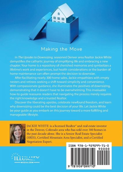 In The Upsides to Downsizing, seasoned Denver area Realtor Jackie White demystifies the cathartic journey of simplifying life and embracing a new chapter. Your home is a repository of cherished memories and symbolizes a lifetime's work and experiences, but health considerations or the burden of home maintenance can often prompt the decision to downsize. After facilitating nearly 300 home sales, Jackie empathizes with empty nesters and retirees seeking a shift toward simplicity and convenience. With compassionate guidance, she illuminates the positives of downsizing, demonstrating that it doesn't have to be overwhelming. This invaluable how-to guide reassures readers that navigating the process merely requires the right knowledge and a trusted Realtor. Discover the liberating upsides, celebrate newfound freedom, and learn why downsizing could be the best decision of your life. Let Jackie White be your guide as you embark on this journey toward a more fulfilling and manageable lifestyle.