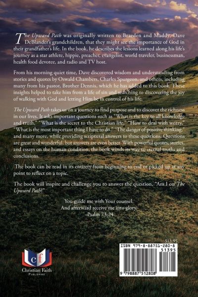 The Upward Path was originally written to Braeden and Maddy, Dave DeBlander's grandchildren, that they might see the importance of God in their grandfather's life. In the book, he describes the lessons learned along his life's journey as a star athlete, hippie, preacher, evangelist, world traveler, businessman, health food devotee, and radio and TV host. From his morning quiet time, Dave discovered wisdom and understanding from stories and quotes by Oswald Chambers, Charles Spurgeon, and others, including many from his pastor, Brother Dennis, which he has added to this book. These insights helped to take him from a life of sin and searching to discovering the joy of walking with God and letting Him be in control of his life. The Upward Path takes us on a journey to find purpose and to discover the richness in our lives. It asks important questions such as "What is the key to all knowledge and truth," "What is the secret to the Christian life," "How to deal with worry," "What is the most important thing I have to do," and many more, while providing scriptural answers to these questions. Questions are great and wonderful, but answers are even better. With powerful quotes, stories, and essays on the human condition, the book winds its way to eternal truths and conclusions. The book can be read in its entirety from beginning to end or picked up at any point to reflect on a topic. The book will inspire and challenge you to answer the question, "Am I on The Upward Path?" You guide me with Your counsel, And afterward receive me into glory. --Psalm 73:24