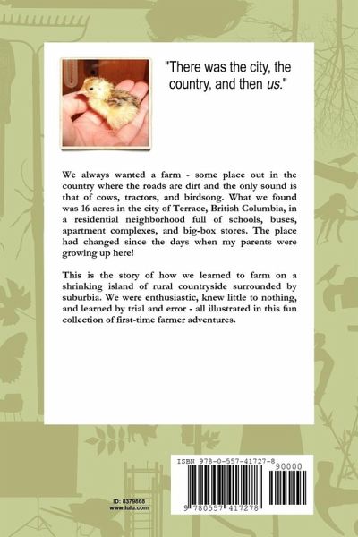 THE URBAN FARMER is a collection of humorous true stories chronicling the ups-and-downs of a family farming for the first time. Surrounded by the challenges of living in a suburban neighborhood, the author learns by trial-and-error everything from castrating calfs and pickling eggs to confronting hungry bears, killer bunnies, and leagues of neighborhood dogs. Based in Terrace, British Columbia.