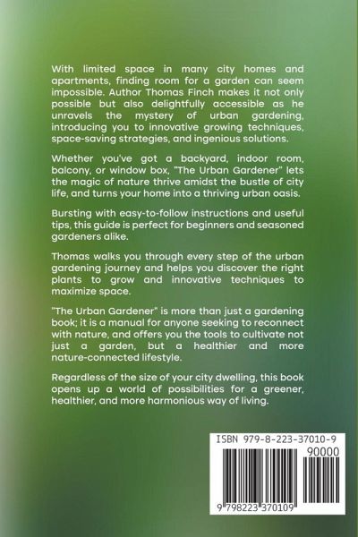 With limited space in many city homes and apartments, finding room for a garden can seem impossible. Author Thomas Finch makes it not only possible but also delightfully accessible as he unravels the mystery of urban gardening, introducing you to innovative growing techniques, space-saving strategies, and ingenious solutions. Whether you've got a backyard, indoor room, balcony, or window box, "The Urban Gardener" lets the magic of nature thrive amidst the bustle of city life, and turns your home into a thriving urban oasis. Bursting with easy-to-follow instructions and useful tips, this guide is perfect for beginners and seasoned gardeners alike. Thomas walks you through every step of the urban gardening journey and helps you discover the right plants to grow and innovative techniques to maximize space. "The Urban Gardener" is more than just a gardening book; it is a manual for anyone seeking to reconnect with nature, and offers you the tools to cultivate not just a garden, but a healthier and more nature-connected lifestyle. Regardless of the size of your city dwelling, this book opens up a world of possibilities for a greener, healthier, and more harmonious way of living.