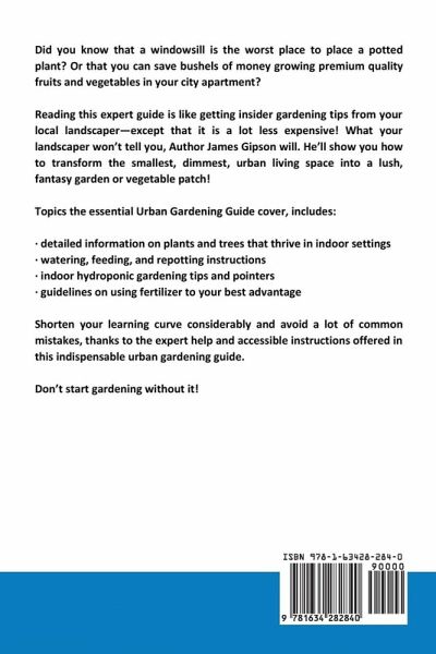 Did you know that a windowsill is the worst place to place a potted plant? Or, that you can save bushels of money growing premium quality fruits and vegetables in your city apartment? Gardener and landscaper, James Gipson, gives you all the information you'll every need to become the best urban gardener in your neighborhood. Reading this expert guide is like getting "insider" gardening tips from your local landscaper--except that it is a lot less expensive! What your landscaper won't tell you, Gipson will. He'll show you how to transform the smallest, dimmest, urban living space into a lush, fantasy garden or vegetable patch! If your living space receives at least 6 to 8 hours of sunlight per day you're good as gold -- and if it doesn't--Gipson will instruct you on how to set up lights that simulate sunlight so that you can still grow a bountiful garden. The essential urban gardening topics Gipson covers, includes: o detailed information on plants and trees that thrive in indoor settings o watering, feeding, and repotting instructions o indoor hydroponic gardening tips and pointers o guidelines on using fertilizer to your best advantage Since too much or too little water and light can kill plants, Gibson provides helpful lists of tips to streamline the watering and lighting process. At every turn, Gipson strives to break down complicated procedures into basic rules that are easy to follow and understand. Gipson clearly loves gardening and does his best to ensure that his readers grow to love it, too! Readers will find dozens of tips on growing healthy plants in just about every type of urban setting, including outside balconies. You'll shorten your learning curve considerably and avoid a lot of common mistakes, thanks to the expert help and accessible instructions offered in this indispensable urban gardening guide. Don't start gardening without it!