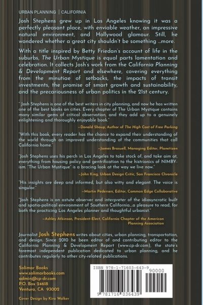 Josh Stephens grew up in Los Angeles knowing that it was a perfectly pleasant place, with enviable weather, an impressive natural environment, and Hollywood glamour. But, still, he wondered whether a great city shouldn't be something ... more. With a title inspired by Betty Friedan's account of life in the suburbs, The Urban Mystique is equal part lamentation and celebration. It collects some of Josh's work from the California Planning & Development Report and elsewhere, covering everything from the minutiae of setbacks, the regional impacts of transit investments, the promise of smart growth and sustainability, the precariousness of urban politics in the 21st century, and the ineffable complexities that make all cities, be they in California or anywhere else, wondrous, maddening, and fascinating.