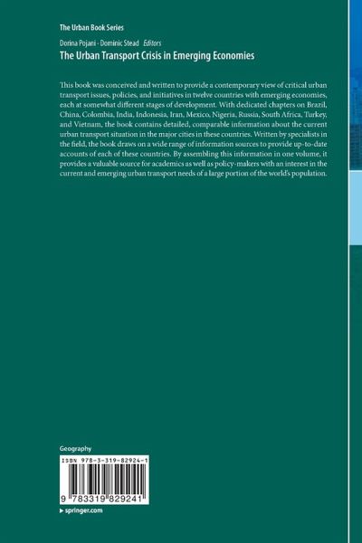 This edited volume discuses urban transport issues, policies, and initiatives in twelve of the world's major emerging economies - Brazil, China, Colombia, India, Indonesia, Iran, Mexico, Nigeria, Russia, South Africa, Turkey, and Vietnam - countries with large populations that have recently experienced large changes in urban structure, motorization and all the associated social, economic, and environmental impacts in positive and negative senses. Contributions on each of these twelve countries focus on one or more major cities per country.