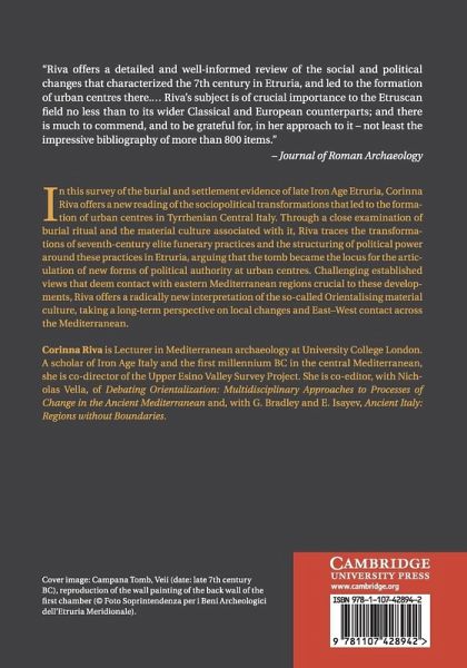 In this survey of the burial and settlement evidence of late Iron Age Etruria, Corinna Riva offers a new reading of the socio-political transformations that led to the formation of urban centres in Tyrrhenian central Italy. Through a close examination of burial ritual and the material culture associated with it, Riva traces the transformations of seventh-century elite funerary practices and the structuring of political power around these practices in Etruria, arguing that the tomb became the locus for the articulation of new forms of political authority at urban centres. Challenging established views that deem contact with eastern Mediterranean regions crucial to these developments, Riva offers a radically new interpretation of the so-called Orientalizing material culture, taking a long-term perspective on local changes and east-west contact across the Mediterranean.