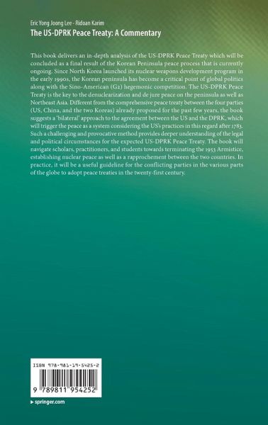 This book delivers an in-depth analysis of the US-DPRK Peace Treaty which will be concluded as a final result of the Korean Peninsula peace process that is currently ongoing. Since North Korea launched its nuclear weapons development program in the early 1990s, the Korean peninsula has become a critical point of global politics along with the Sino-American (G2) hegemonic competition. The US-DPRK Peace Treaty is the key to the denuclearization and de jure peace on the peninsula as well as Northeast Asia. Different from the comprehensive peace treaty between the four parties (US, China, and the two Koreas) already proposed for the past few years, the book suggests a 'bilateral' approach to the agreement between the US and the DPRK, which will trigger the peace as a system considering the US's practices in this regard after 1783. Such a challenging and provocative method provides deeper understanding of the legal and political circumstances for the expected US-DPRK Peace Treaty. Thebook will navigate scholars, practitioners, and students towards terminating the 1953 Armistice, establishing nuclear peace as well as a rapprochement between the two countries. In practice, it will be a useful guideline for the conflicting parties in the various parts of the globe to adopt peace treaties in the twenty-first century.