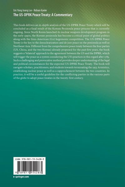 This book delivers an in-depth analysis of the US-DPRK Peace Treaty which will be concluded as a final result of the Korean Peninsula peace process that is currently ongoing. Since North Korea launched its nuclear weapons development program in the early 1990s, the Korean peninsula has become a critical point of global politics along with the Sino-American (G2) hegemonic competition. The US-DPRK Peace Treaty is the key to the denuclearization and de jure peace on the peninsula as well as Northeast Asia. Different from the comprehensive peace treaty between the four parties (US, China, and the two Koreas) already proposed for the past few years, the book suggests a 'bilateral' approach to the agreement between the US and the DPRK, which will trigger the peace as a system considering the US's practices in this regard after 1783. Such a challenging and provocative method provides deeper understanding of the legal and political circumstances for the expected US-DPRK Peace Treaty. Thebook will navigate scholars, practitioners, and students towards terminating the 1953 Armistice, establishing nuclear peace as well as a rapprochement between the two countries. In practice, it will be a useful guideline for the conflicting parties in the various parts of the globe to adopt peace treaties in the twenty-first century.