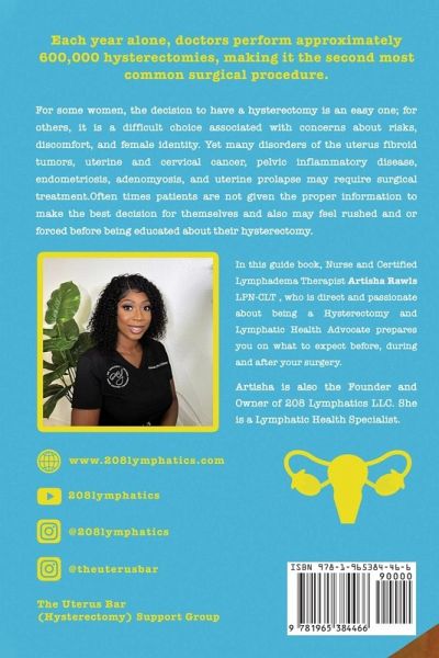 In this Informative Hysterectomy Guide Book Nurse and Certified Lymphedema Therapist Artisha Rawls is a guiding light for Women Hysterectomy Health and Wellness. She provides thoroughness and clarity with the following: What is a Hysterectomy, Types of Hysterectomies, What questions to ask your provider, Hysterectomy Checklist, Hysterectomy Nutrition, Pre-Op and Post-Op Hysterectomy Care, Hysterectomy Nutrition & Recovery, Self Care Coping Advice and Suggestions, What to Expect Before, During and After Hysterectomy.